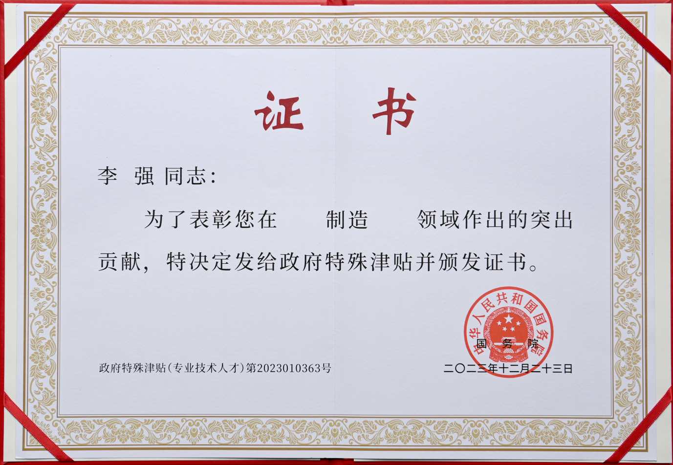 必赢242net官网副总经理李强获授国务院政府特殊津贴